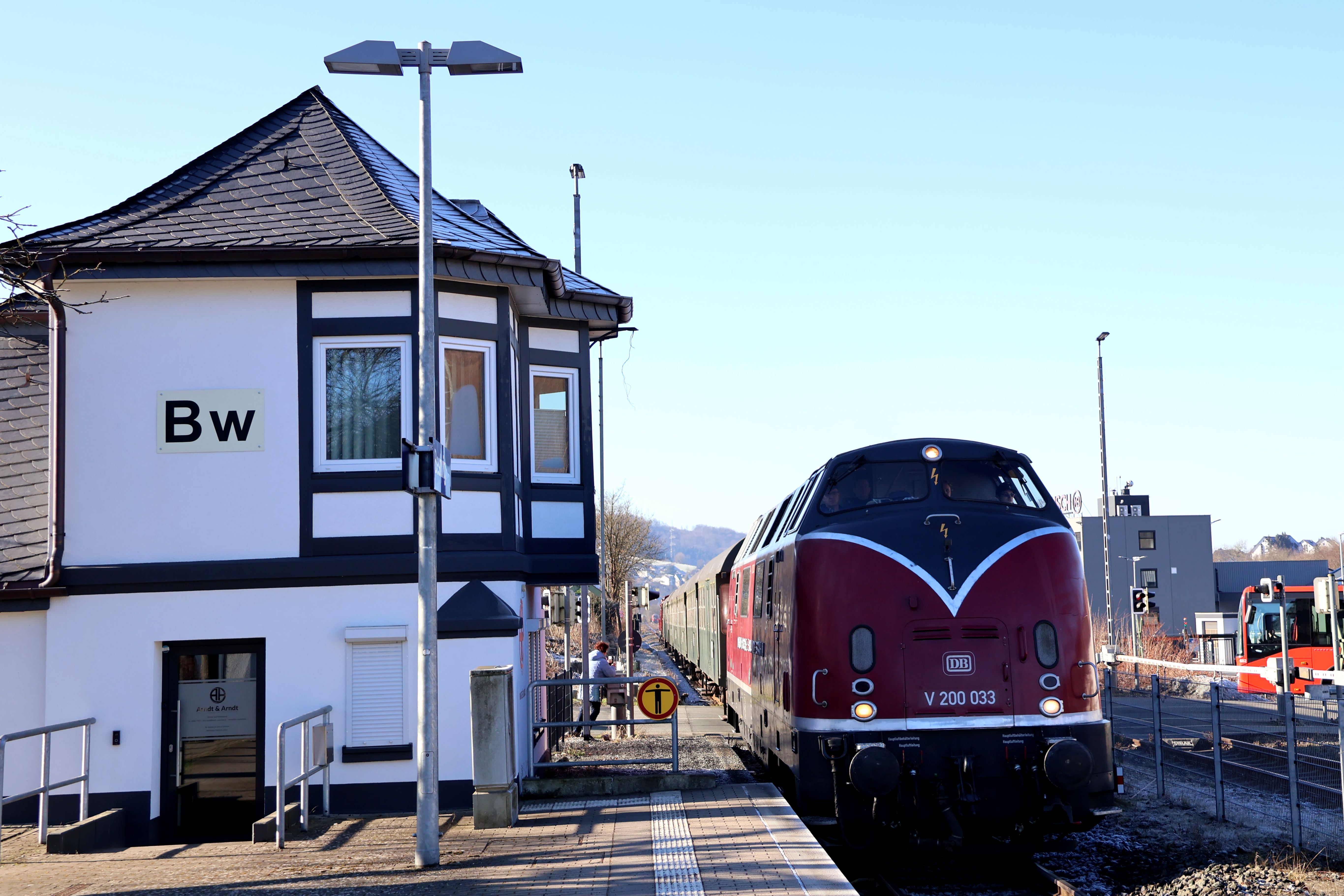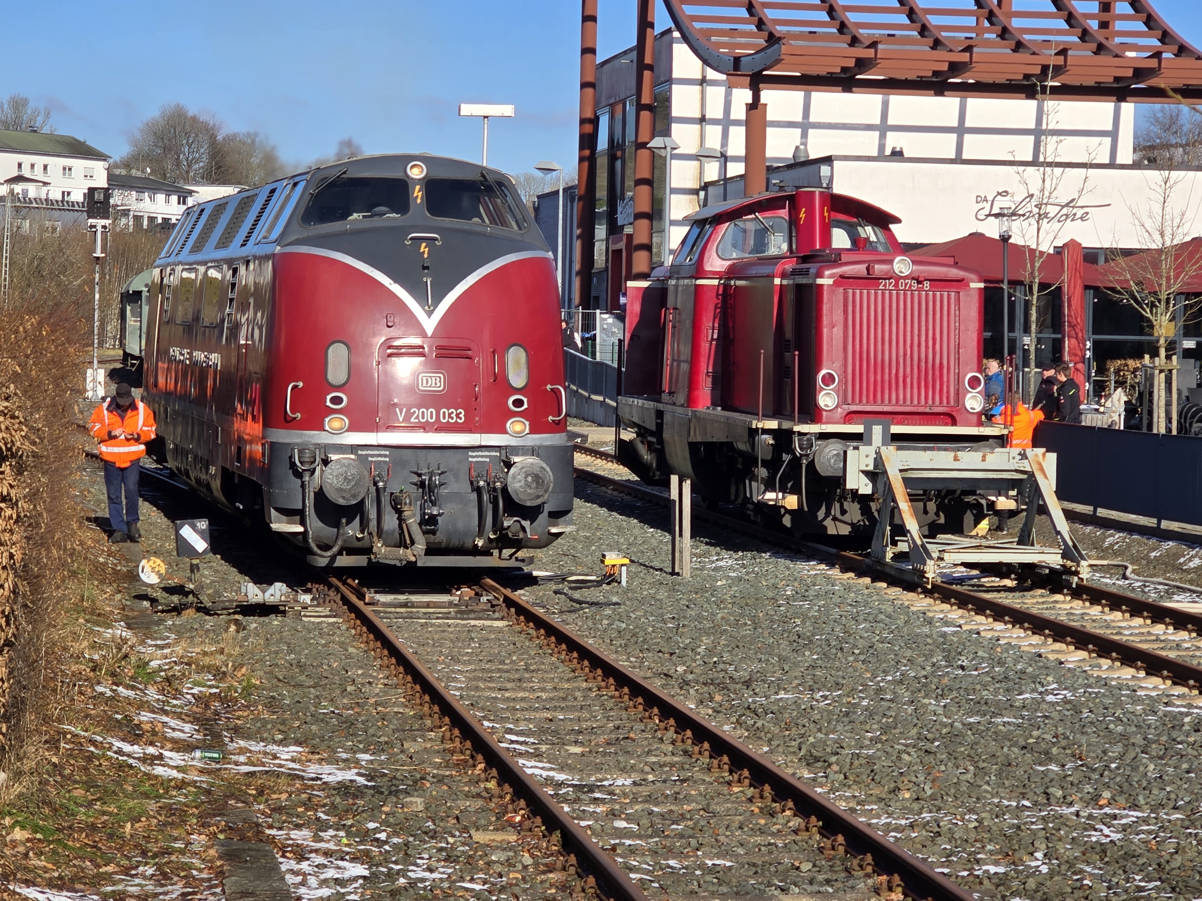 Wenige Meter weiter mussten wir wegen einem beschädigten Bahnübergang noch einmal anhalten. Die Wiederanfahrt hat Peter Müller aus Schmallenberg auf Video festgehalten: https://www.youtube.com/watch?v=UPo_8-1SOO0 . Man merkt deutlich die Steigung und die Tatsache, dass wir der erste Zug auf der Strecke und die Gleise damit noch rutschig waren, denn DB Regio musste die ersten Fahrten an diesem Tag ausfallen lassen.