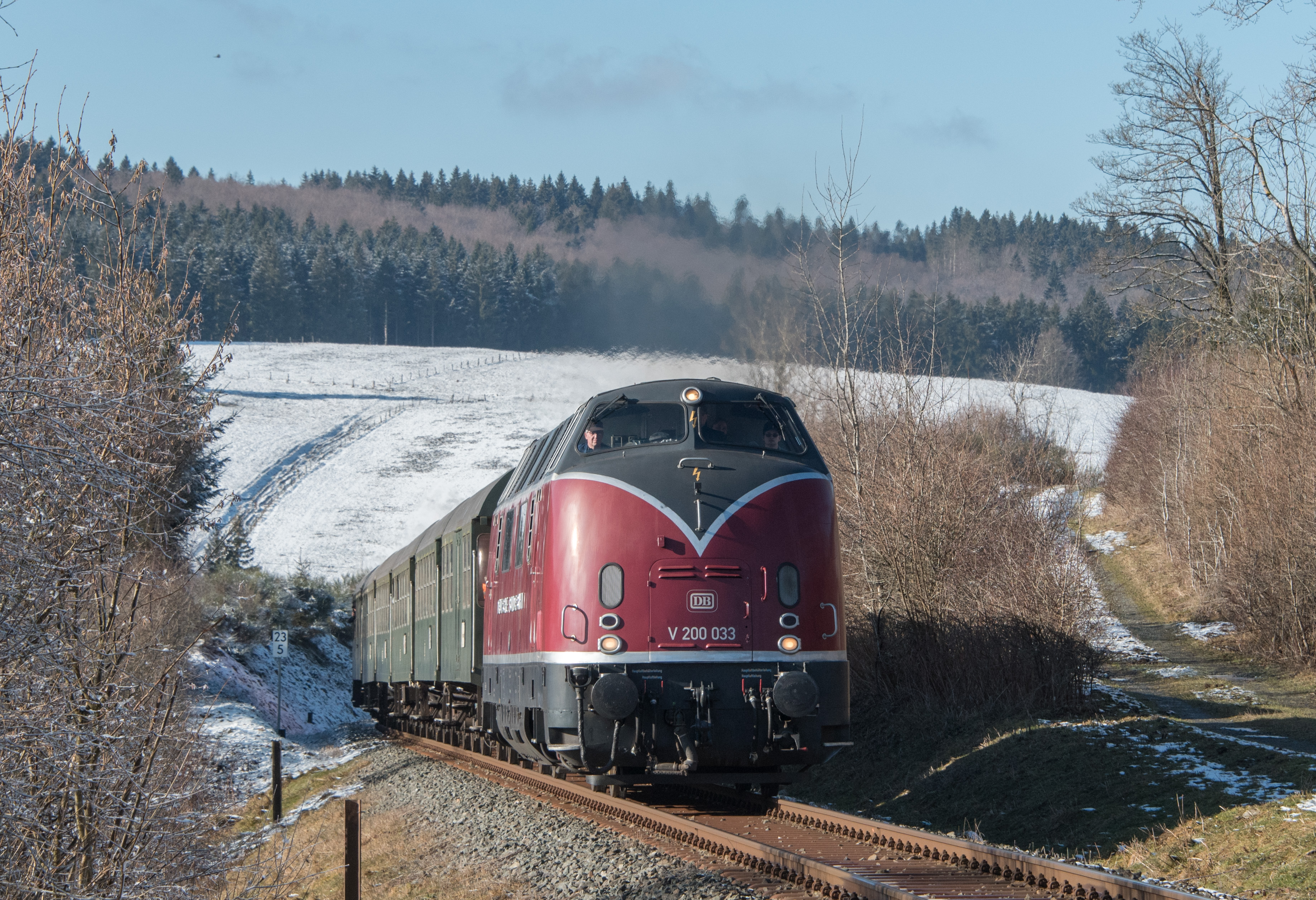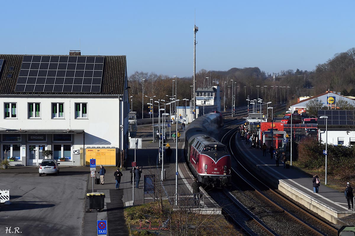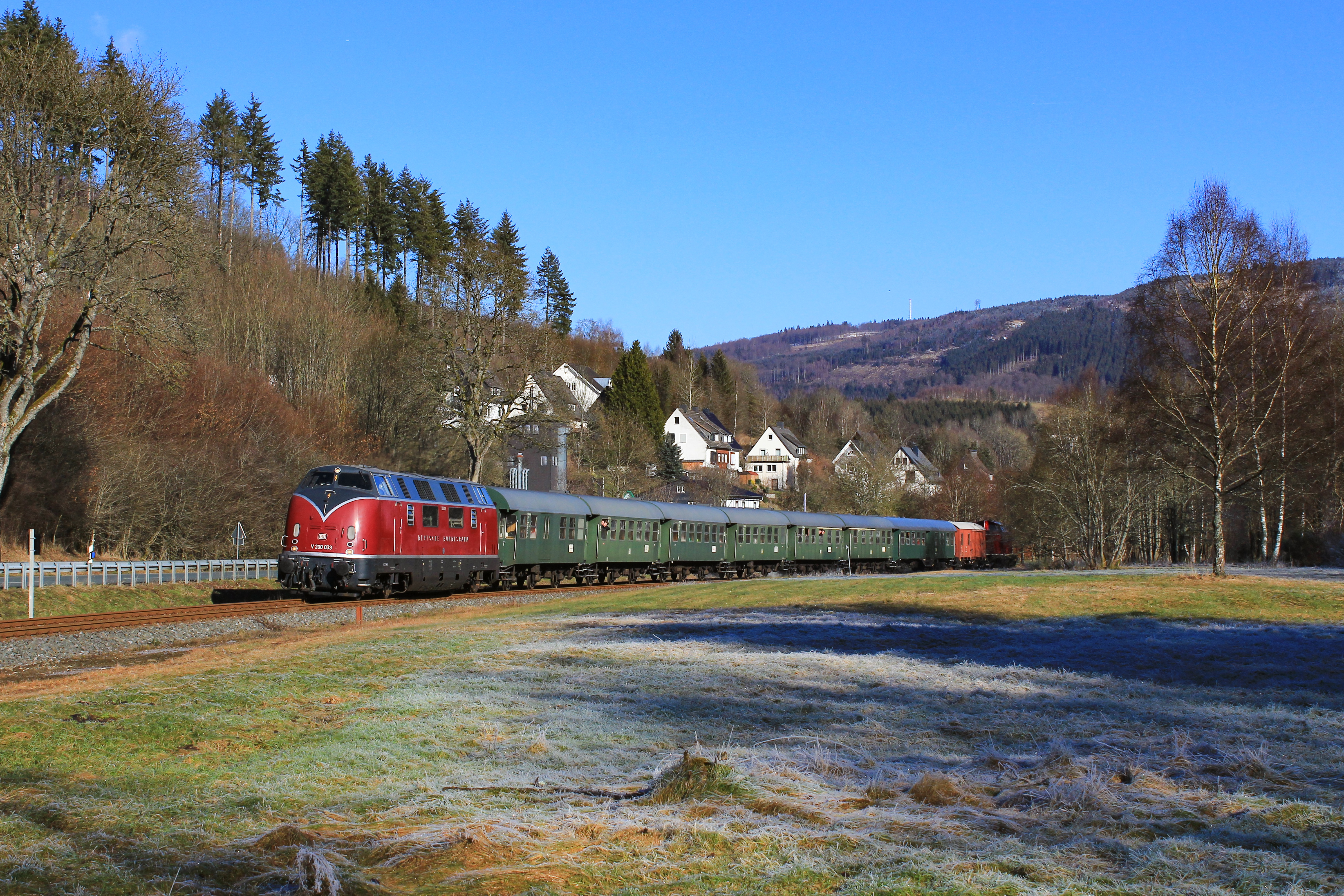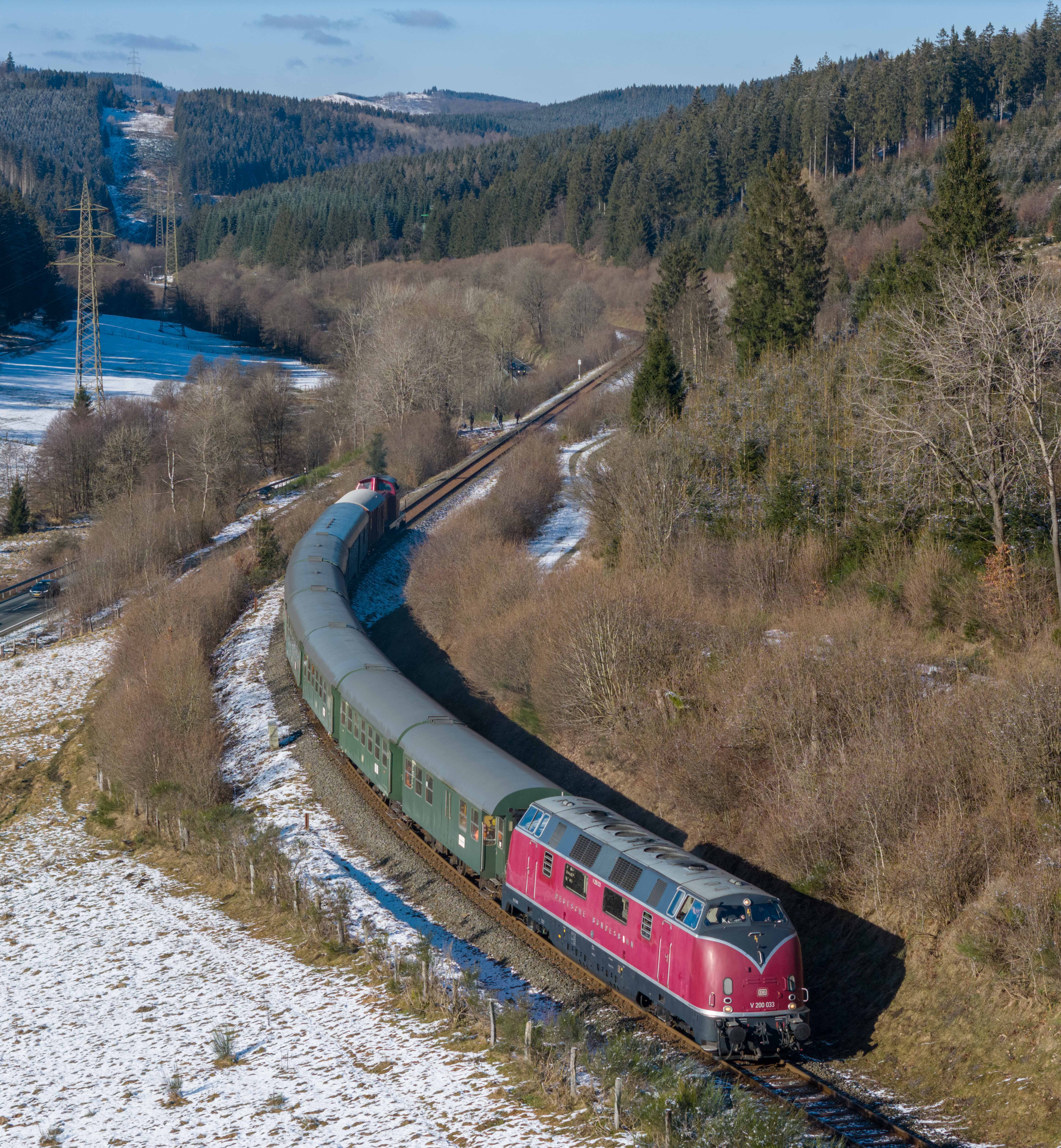 Dann ging es ohne jeden Halt durch das schöne Ruhrtal weiter, ehe wir die letzten 26 km im noch schöneren Negertal (der Fluss dort heißt wirklich so) bergwärts in Angriff nahmen. Da die V 200 gegen die starke Steigung hier richtig arbeiten musste, war gerade dieser Abschnitt auch für die vielen Zaungäste ein Genuss. Deshalb waren Heerscharen von Fotografen an der Strecke, die sich die Fahrt mit unserer V 200 033 nicht entgehen lassen wollten.