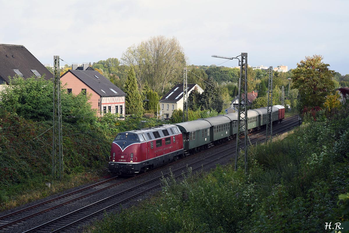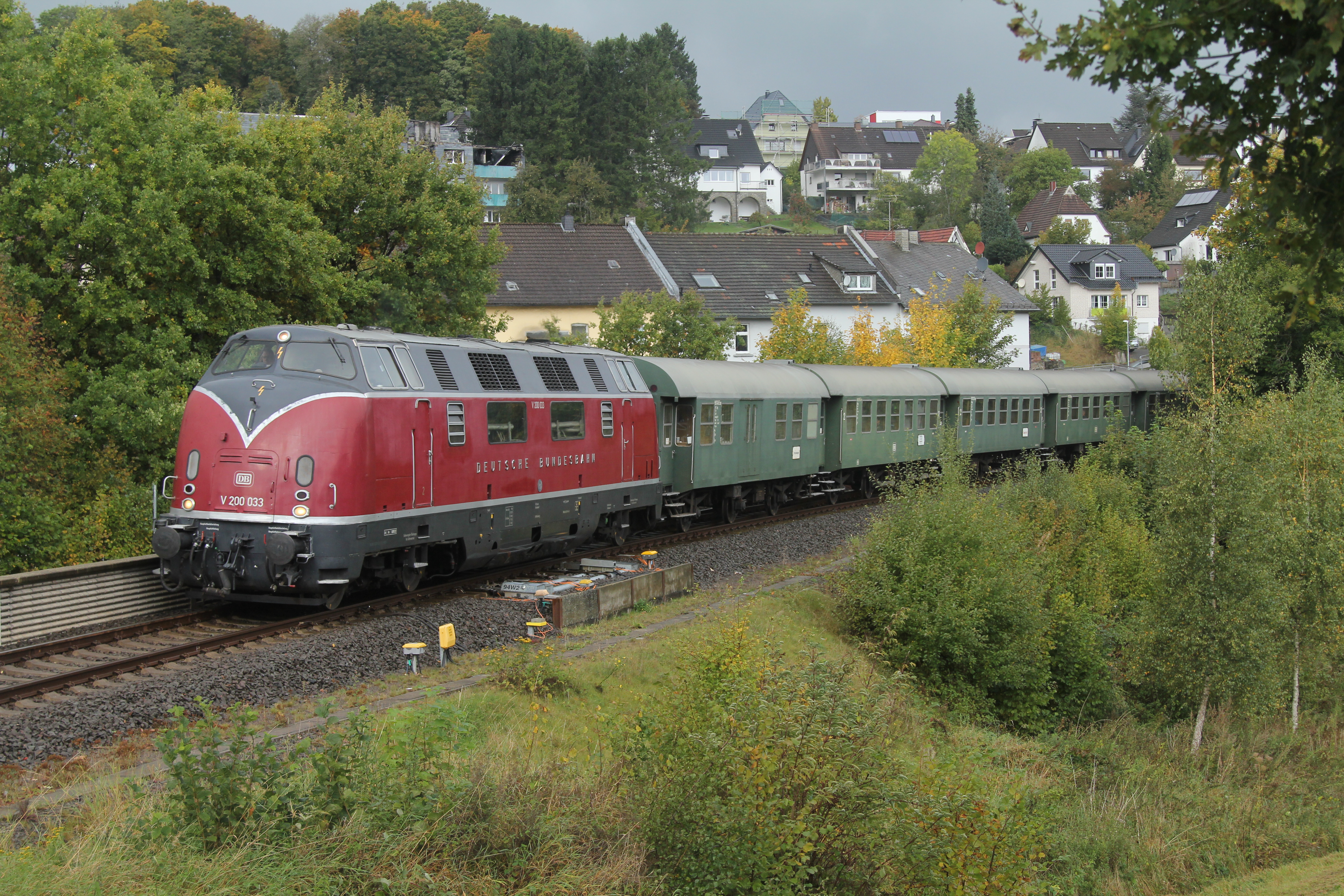 Nach Koblenz wollten wir im September mit der 194 158 fahren, damit sie noch eine öffentliche Fahrt zu ihrem 80. Geburtstag bekommen sollte. Es kam anders: Als die Lok schon fahrfertig am Bahnsteig stand, versagte das Zugfunkgerät seinen Dienst und ließ sich leider auch mit Reparaturversuchen nicht mehr reaktivieren. Eine Lösung drängte, wurde aber schnell gefunden: Die von Wartungsarbeiten am Vorabend noch warme V 200 033 wurde geschwind vom Lokschuppen geholt, währenddessen andere Kollegen die 194 wieder vom Zug wegrangierten. Mit einer knappen Stunde Verspätung ging es dann doch noch los.