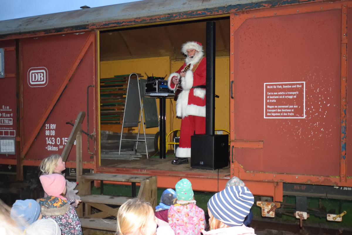 Nun strömen alle kleinen und großen Fahrgäste auf den Bahnsteig, denn jetzt wird unser gedeckter Güterwagen am Bahnsteig zur Bühne, die der Nikolaus nun besteigt. Dort kann ihn jeder sehen, und dort ist auch ein trockener Platz, wo er nun die Weihnachtslieder anstimmen kann. Alle Kinder und viele Erwachsene singen die Weihnachtslieder mit, was besonders bei den Nachmittagsfahrten auf dem schon dämmerigen Bahnsteig sehr stimmungsvoll war.