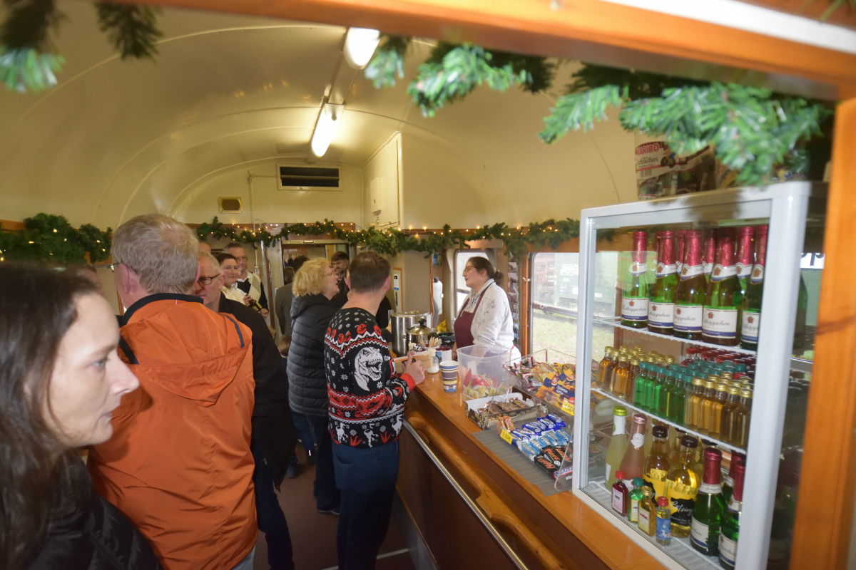 Derweil wurden auf dem Zug eifrig frische Waffeln gebacken, den Großen Glühwein oder Kaffee ausgeschenkt, den Kindern Kakao oder Tee. Eine frische Bockwurst nicht nur für die Väter fand ebenfalls guten Absatz. Auch diese Bewirtung durch unser tolles Gastro-Team trug zu drei erfolgreichen Fahrten bei, ebenso natürlich die gute und sichere Beförderung und Leitung des Zugs durch unsere Lokführer, Zugführer und Zugassistenten.