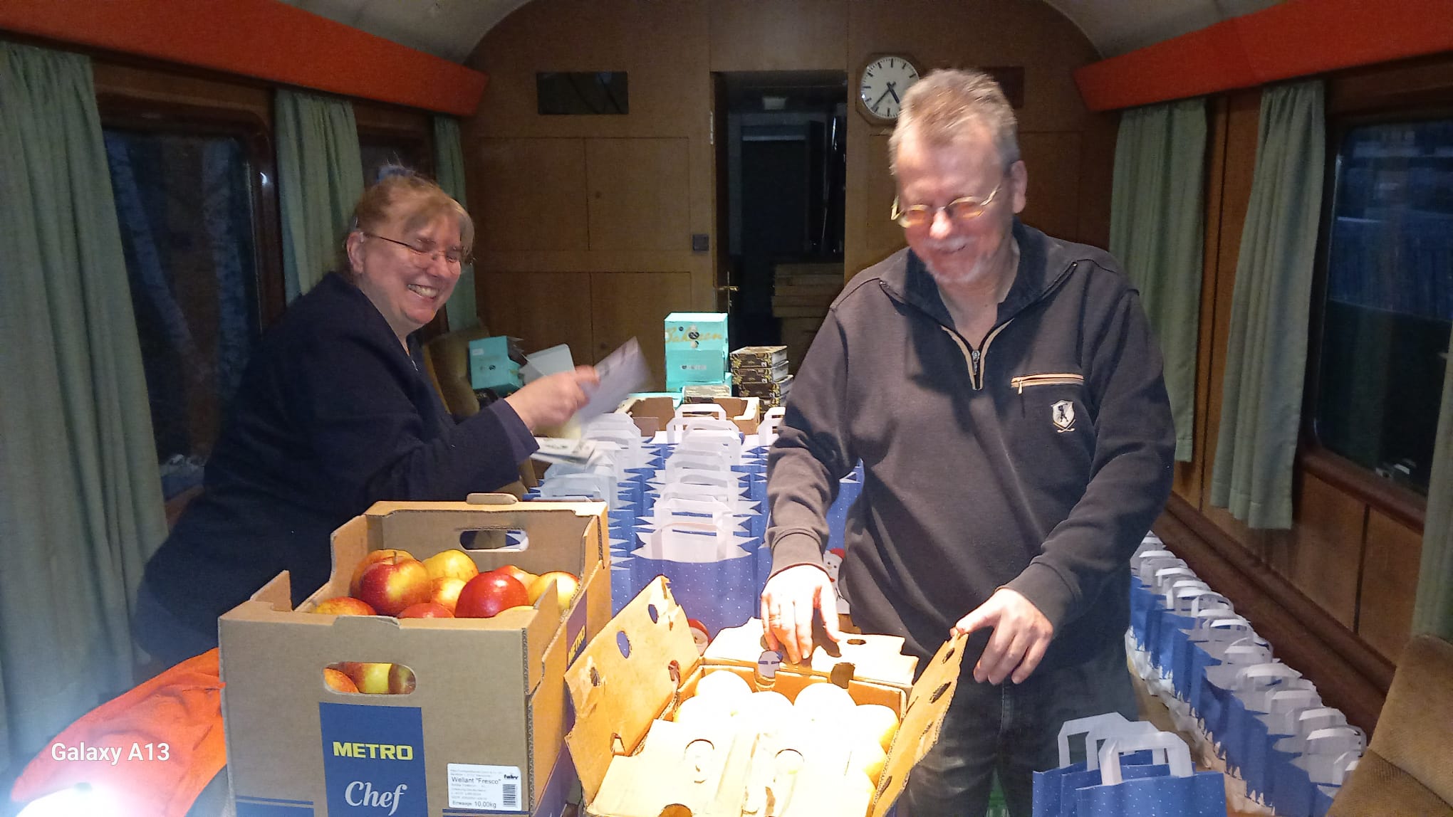 So war es auch in diesem Jahr, wo schon lange vor der Abfahrt an unserem Lokschuppen in Hamm Süd klein und groß zusammenströmten und den Zug füllten, der nach dem zweiten Zustieg am Maxi-Park bis auf den letzten Platz besetzt war. Über 270 Kinder waren zu den drei Fahrten im Zug. Damit diese alle zu ihrem Recht und ihrer Nikolaustüte kommen konnten, waren Tage vorher schon fleissige Helfer des Nikolaus tätig, die die Gabentüten vorbereiteten.