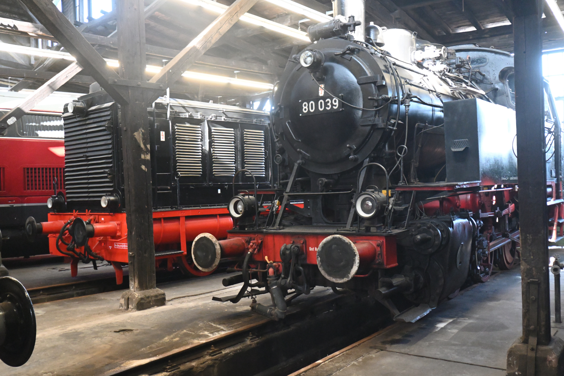 Freundlicherweise hatte auch der Gastgeber Ludger Guttwein den Lokschuppen geöffnet, so dass die Exponate seiner Sammlung aus Dampf- und Diesellokomotiven, von denen viele einen Bezug zum Bw Altenbeken haben, besichtigt werden konnten. Auch unsere 80 039, die wir ihm vor knapp zwei Jahren anvertraut hatten und die noch auf die betriebsfähige Aufarbeitung wartet, konnten wir so wiedersehen.