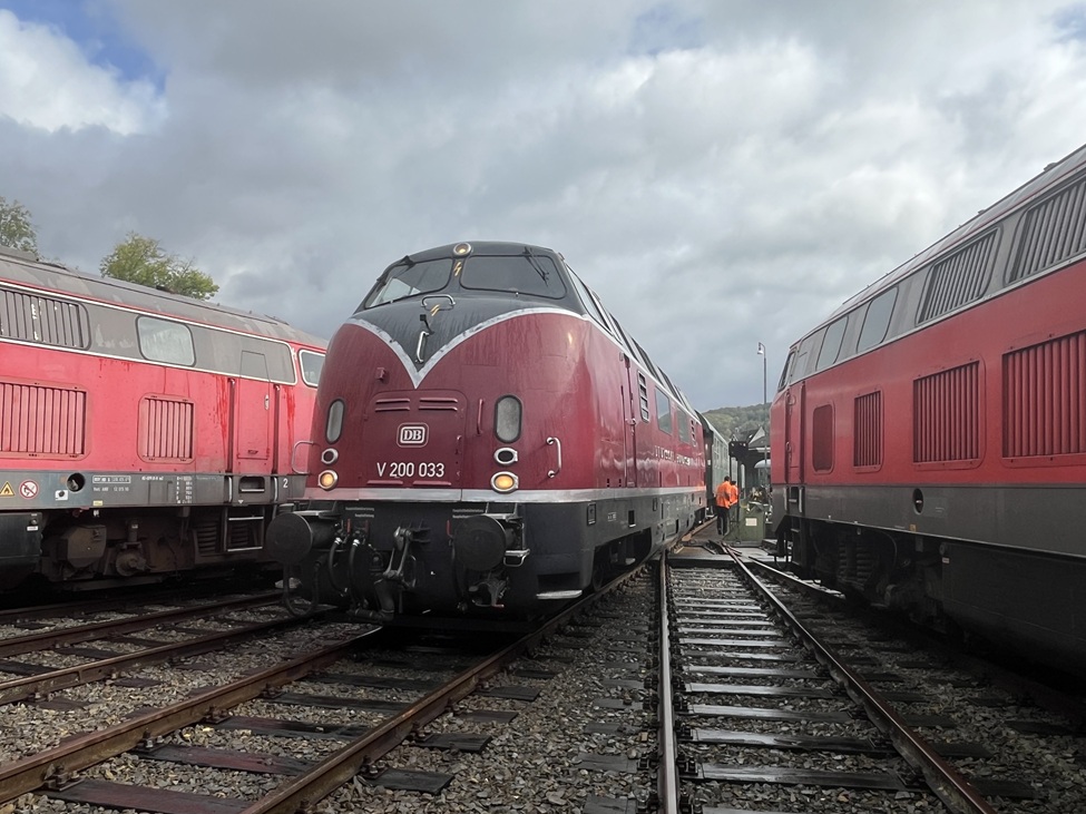 Nach Koblenz wollten wir im September mit der 194 158 fahren, damit sie noch eine öffentliche Fahrt zu ihrem 80. Geburtstag bekommen sollte. Es kam anders: Als die Lok schon fahrfertig am Bahnsteig stand, versagte das Zugfunkgerät seinen Dienst und ließ sich leider auch mit Reparaturversuchen nicht mehr reaktivieren. Eine Lösung drängte, wurde aber schnell gefunden: Die von Wartungsarbeiten am Vorabend noch warme V 200 033 wurde geschwind vom Lokschuppen geholt, währenddessen andere Kollegen die 194 wieder vom Zug wegrangierten. Mit einer knappen Stunde Verspätung ging es dann doch noch los.